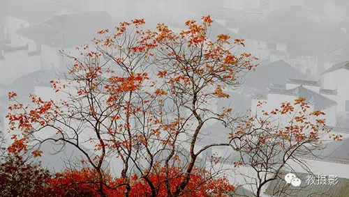 6.行使石头前面的红叶作为前景,把背景作为高低,但是肯定要隐隐看到徽派建筑。